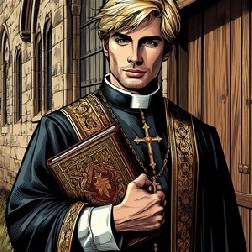 | Élu de Dénéïr, dieu des glyphes, de la connaissance et de toutes les icônes. Il a créé une cathédrale « l'Envol de l'Esprit » (au prix de sa jeunesse, qui lui a été rendue après, Dénéïr ayant voulut tester sa foi) où tous les prêtres de toutes les divinités du bien peuvent se rassembler et célébrer leur culte. | |