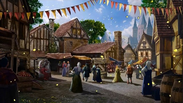 | Historiquement, ce bourg est moins une petite ville populeuse qu’un antique lieu sacré, où, dit-on, les premiers elfes venus sur Nacridan avaient coutume de se livrer à d’anciennes cérémonies votives visant à apaiser le courroux de la Nature par des processions chantées, des offrandes de fleurs et de fruits du printemps, ainsi que de sanglants sacrifices humains. Après quoi, coincé entre les armées opposées de Djinn, Octobian et Tonak, le destin du bourg, en toute logique, était de finir en cendres piétinées par les armées en marche. Il n’en fut rien grâce à l’habilité politique des marchands natifs de la ville qui firent de celle-ci un espace de commerce neutre entre les cités rivales, comprenant qu’en politique, il est toujours bon d’avoir un endroit sûr pour se rencontrer entre ennemis mortels. Comme son nom l’indique, le bourg de Marché-aux-Ducs est devenu depuis le plus important centre d’échanges et de commerce de tout l’est de l’Ile ; sous la protection intéressée du puissant clan des Nainkridhin. |